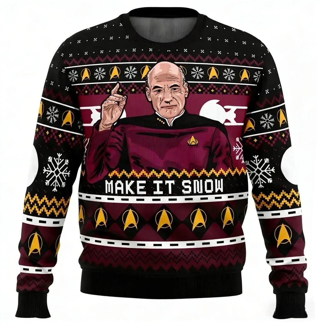 Jean-Luc Picard Kawaii Printed Sweater: Celebrate Starfleet style with the Jean-Luc Picard Kawaii Printed Sweater, blending iconic leadership with adorable anime-inspired charm. This sweater transforms a legendary captain into a playful design that stands out instantly. Perfect for fans who love subtle fandom fashion, it pairs effortlessly with jeans or casual wear. Ideal for conventions, cozy evenings, or gifting, it delivers comfort, personality, and timeless sci-fi nostalgia in one eye-catching statement piece for everyday warmth and expressive pop culture flair.