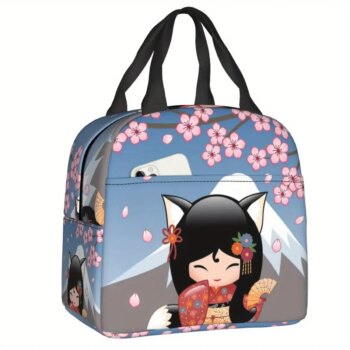 Kawaii Cherry Blossom Kitsune Kokeshi Insulated Lunch Bag