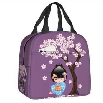 Kawaii Cherry Blossom Kimono Kokeshi Insulated Lunch Bag